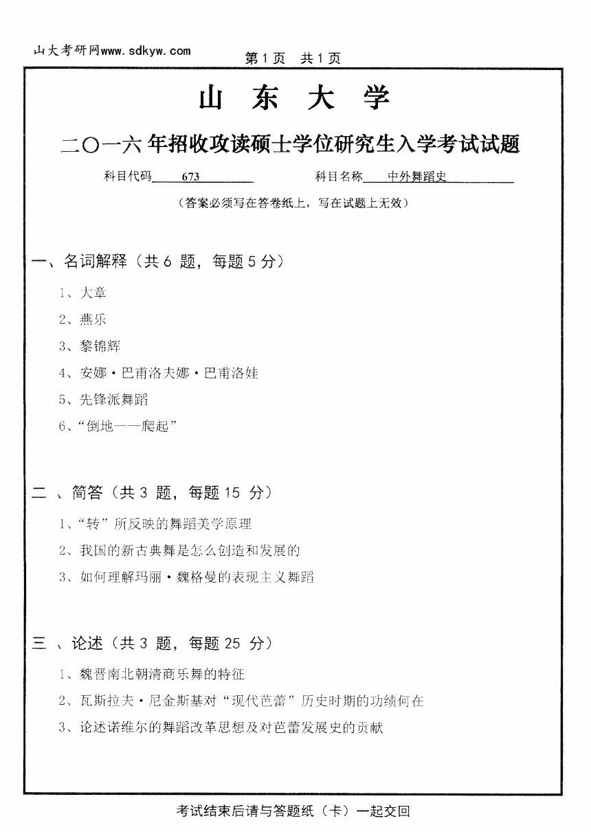 山东大学2016年研究生入学考试673中外舞蹈史初试真题
