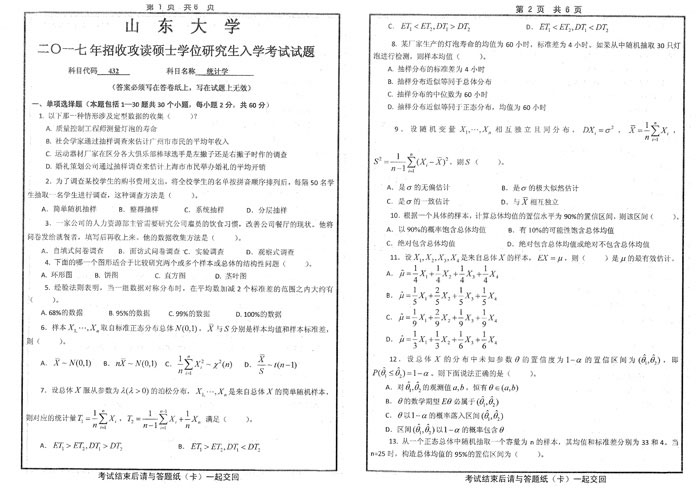 山东大学2017年研究生入学考试435保险专业基础初试真