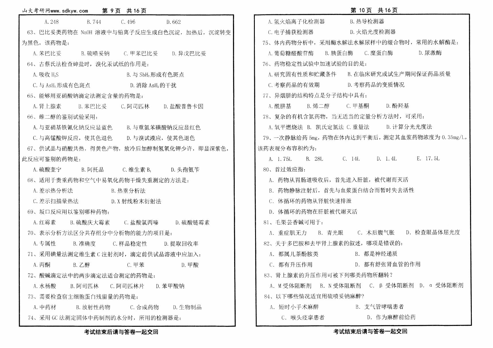 山东大学2016年研究生入学考试649药学专业综合初试真