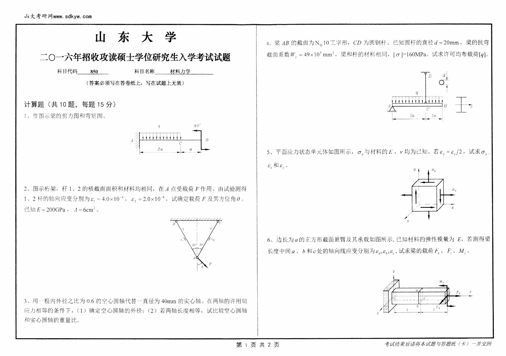 山东大学2016年研究生入学考试910材料力学(专)初试